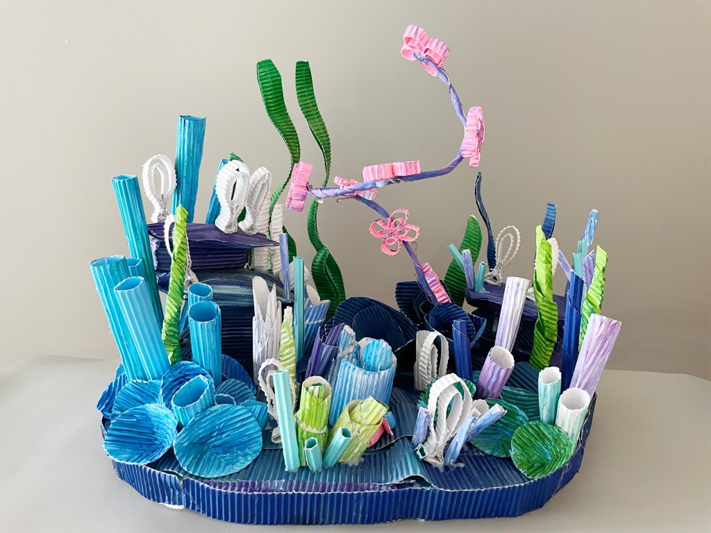 Description: A paper sculpture inspired by the movie Avatar: The Way of Water. I made all kinds of shapes out of corrugated paper to replicate the underwater scenes. I also recreated the glowing butterflies according to the plot of the movie.